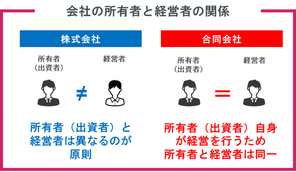 - 合同会社では株式を発行せず、会社の所有と経営を兼ねる形となり、出資者=経営者が基本です。