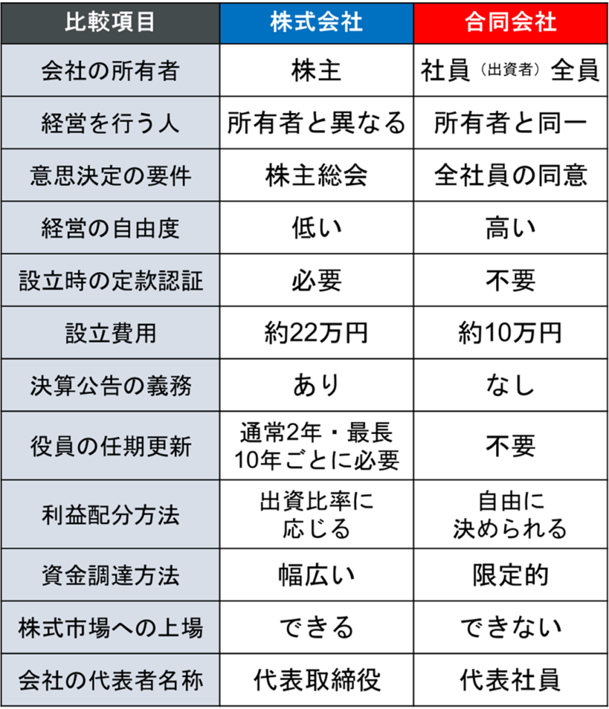 | 社会的信用力・資金調達の可能性 | 株式会社に比べると「合同会社」という形態は認知度がやや低く、資金調達(特に株式発行による調達)はできない。 | 株式を発行でき、外部投資や将来的な上場などの資金調達が可能。社会的信用力も比較的高い。 |
